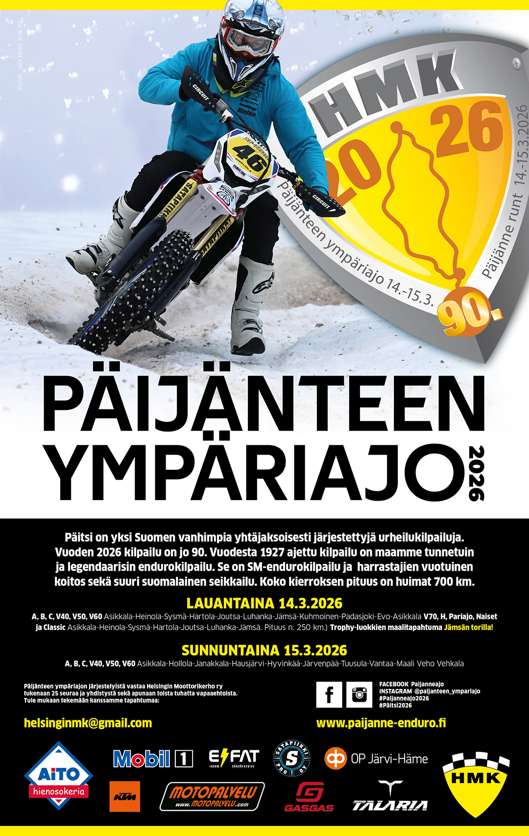 KATSASTUS: A, B, C, V40, V50, V60 pe 13.3.2026 klo 16:00 – 20:00 ja uusintakatsastus tarvittaessa su 15.3.2026 klo 06:30 alkaen. Moottoripyörät jätetään katsastuksen jälkeen suljettuun varikkoon.